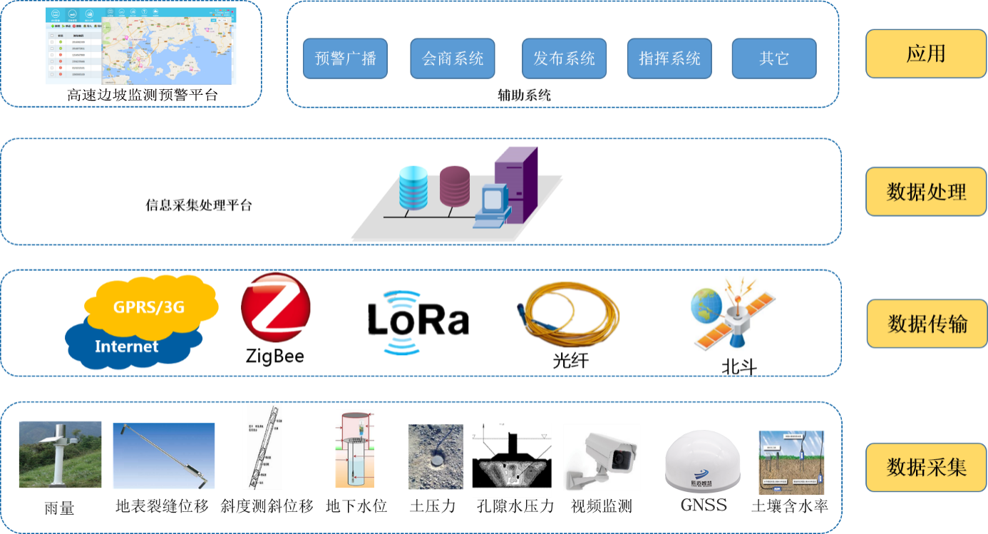 The high slope stability, safety monitoring and early warning system consists of a data acquisition system, a transmission system, a data processing and analysis system, an early warning release system, and auxiliary facilities.